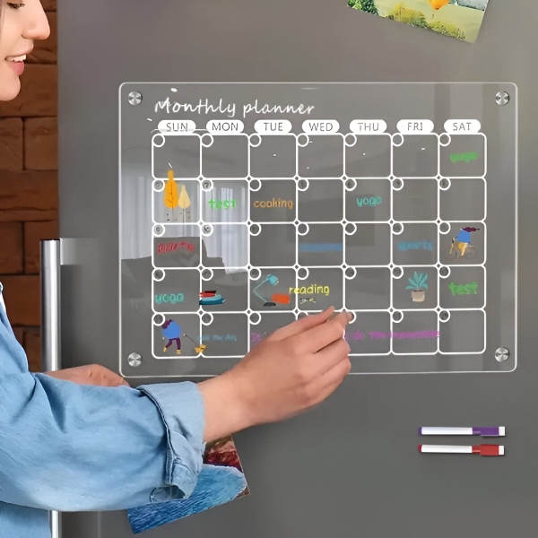 Set calendar frigider din acril – Planificator lunar + săptămânal (fiecare 40 x 30 cm), 4 magneți, ștergere uscată, markere incluse | REUSABLEPLAN