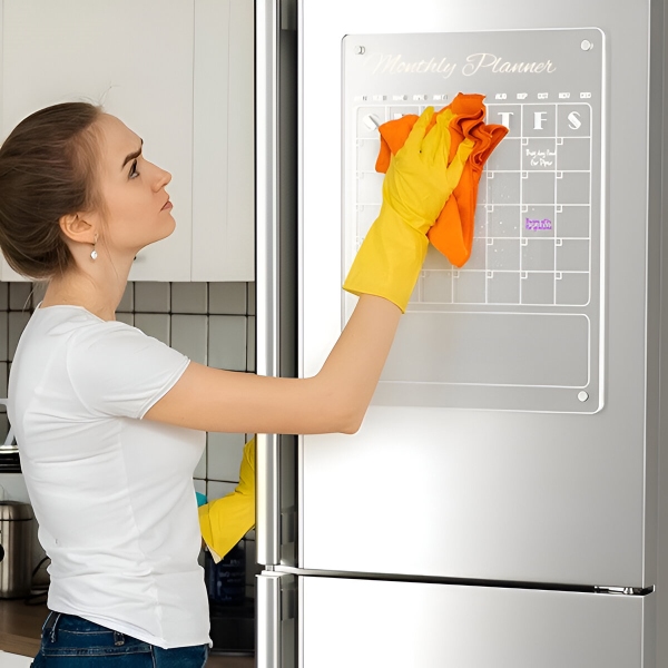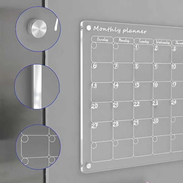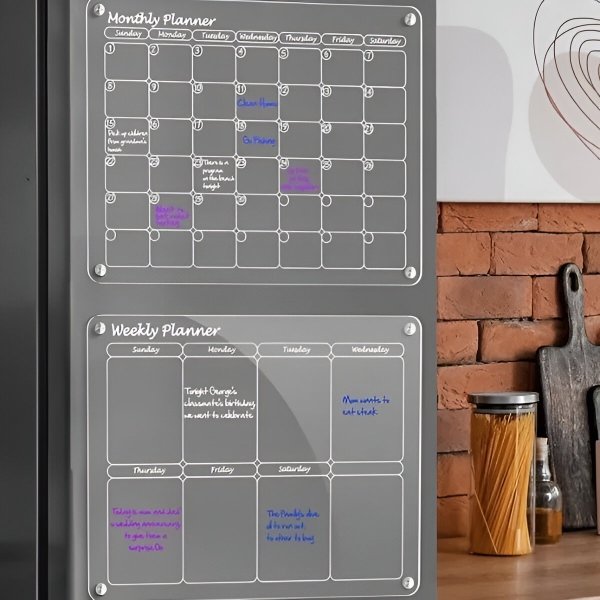 Planificatoarele din hârtie se termină după o lună și merg direct la coș. Suprafața din acril transparent se șterge complet și curat în câteva secunde cu laveta inclusă – fără urme, fără pete, fără reziduuri. Suprafața este rezistentă la zgârieturi și pete, deci rămâne cristalină după sute de ștergeri.
